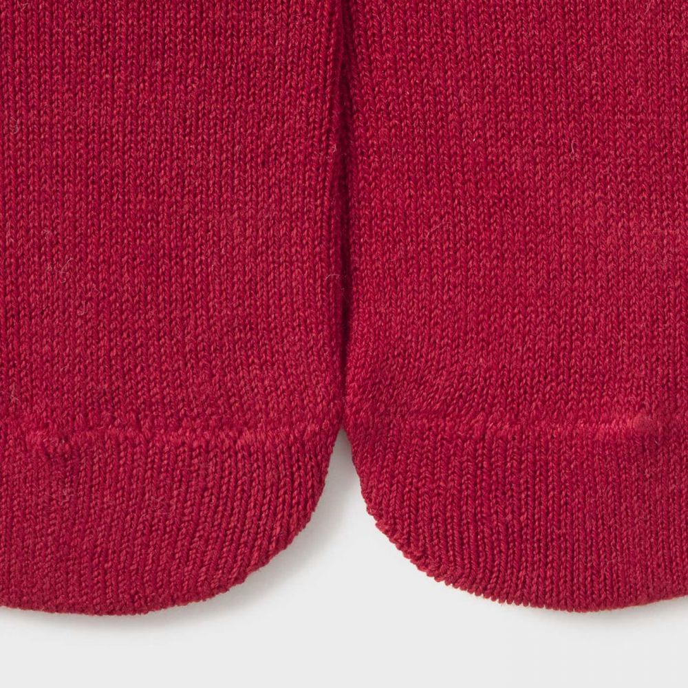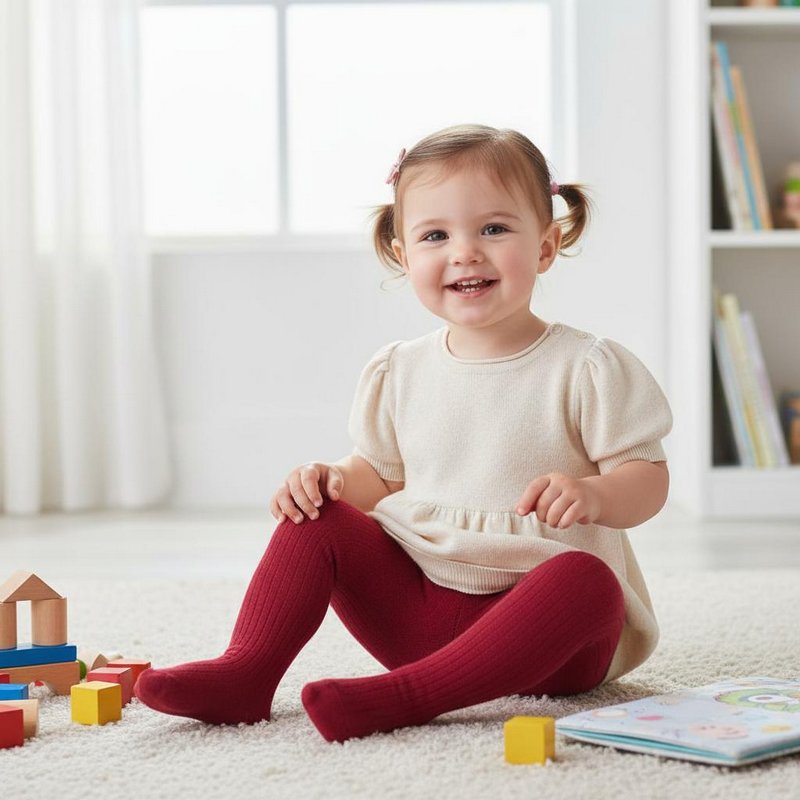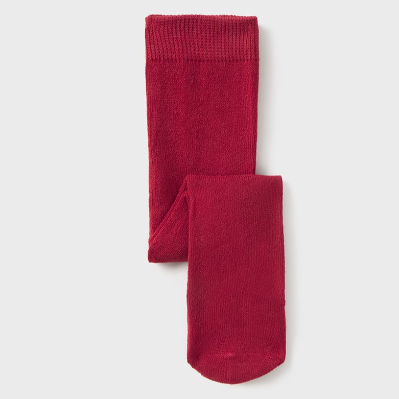 Κερασί βρεφικό καλσόν, ιδανικό για να ολοκληρώσει ένα επίσημο ή γιορτινό ντύσιμο. Είναι κατασκευασμένο από απαλό ύφασμα, πιθανότατα με λεπτή, αστραφτερή υφή που του δίνει μια διακριτική λάμψη. Η απόχρωσή του είναι κόκκινο κερασί γιορτινή, καθιστώντας το εύκολο να συνδυαστεί με διάφορα χρώματα ρούχων.