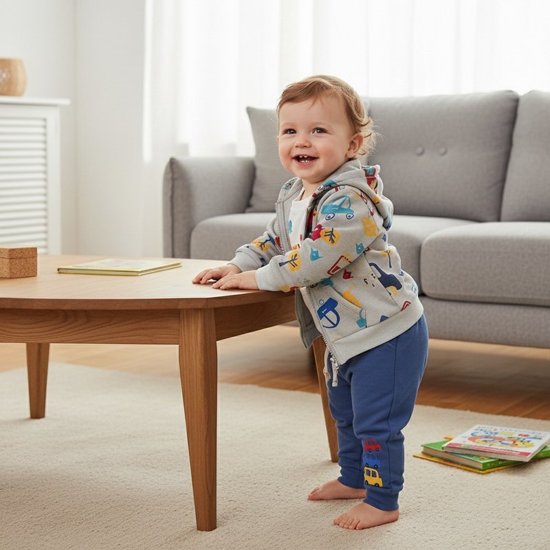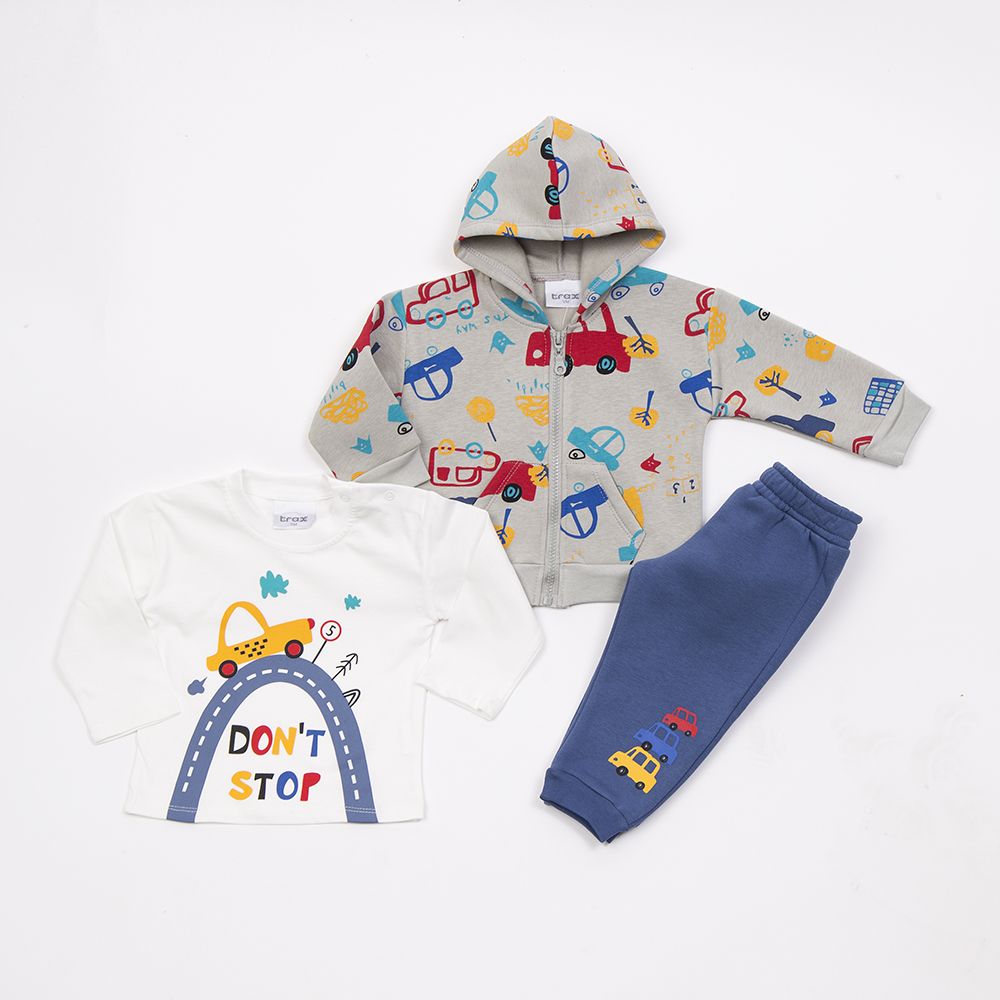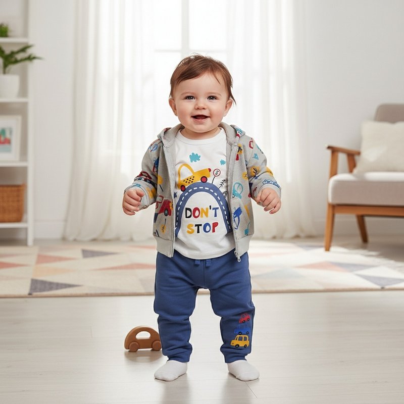 ένα ολοκληρωμένο, άνετο και στυλάτο σύνολο για το μωρό σας; Αυτό το βρεφικό σετ τριών τεμαχίων είναι η ιδανική επιλογή! Μακρυμάνικο μακό μπλουζάκι σε λευκό χρώμα με την φράση "DON'T STOP" και ένα χαριτωμένο αυτοκινητάκι. Ζακέτα με κουκούλα σε γκρι χρώμα με πολύχρωμα σχέδια αυτοκινήτων.Παντελόνι φόρμας σε μπλε χρώμα με κεντημένα αυτοκινητάκια, που ολοκληρώνει το σύνολο. Το σετ είναι κατασκευασμένο από 100% βαμβάκι, προσφέροντας απαλότητα και ελευθερία κινήσεων στο παιδί σας. Ιδανικό για κάθε στιγμή της ημέρας!