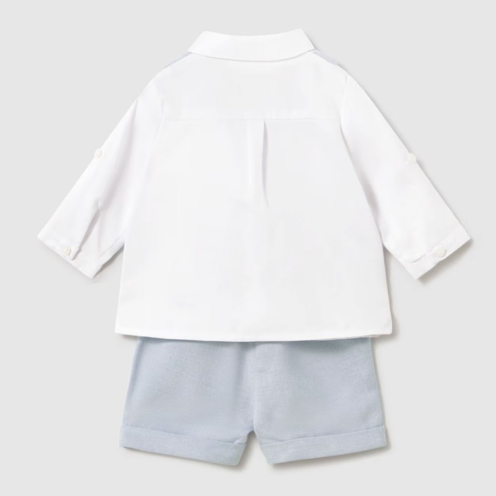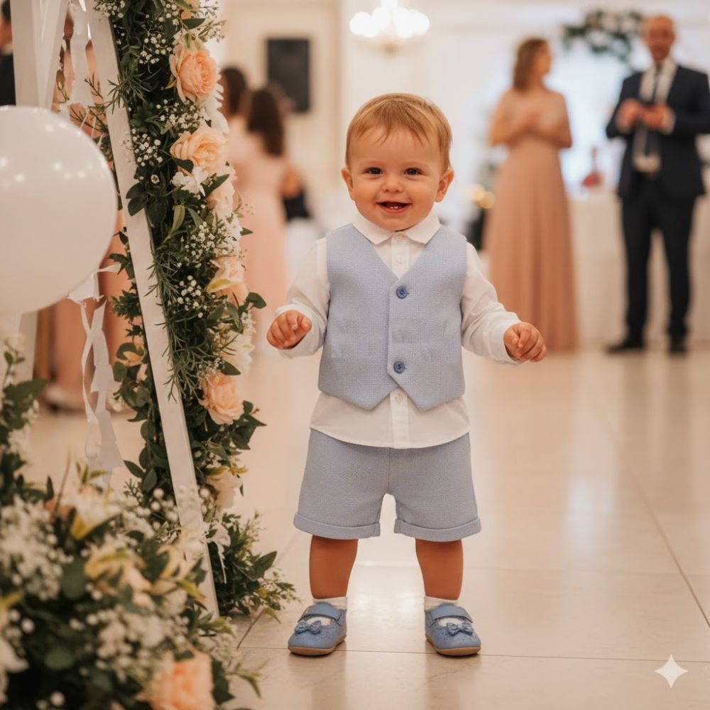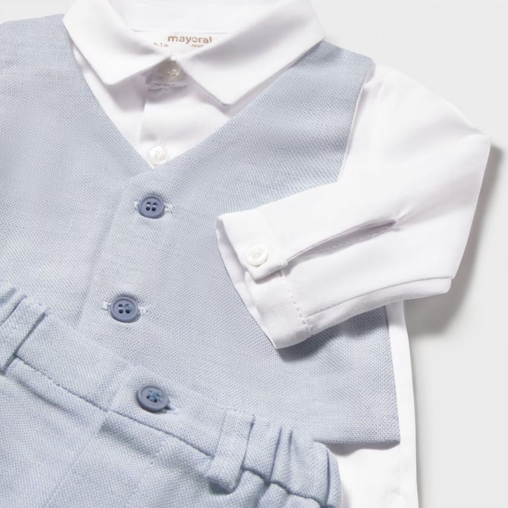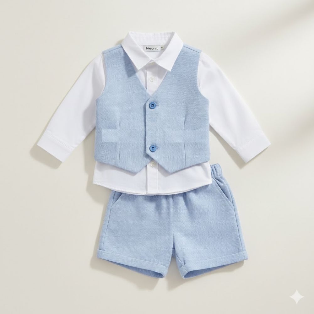 • Πουκάμισο & Γιλέκο: Κλασικό λευκό μακρυμάνικο πουκάμισο με ενσωματωμένο (ραμμένο) γιλέκο σε υπέροχη σιελ απόχρωση. Διαθέτει δύο κομψά κουμπιά στο μπροστινό μέρος για αληθινό look μικρού κυρίου.