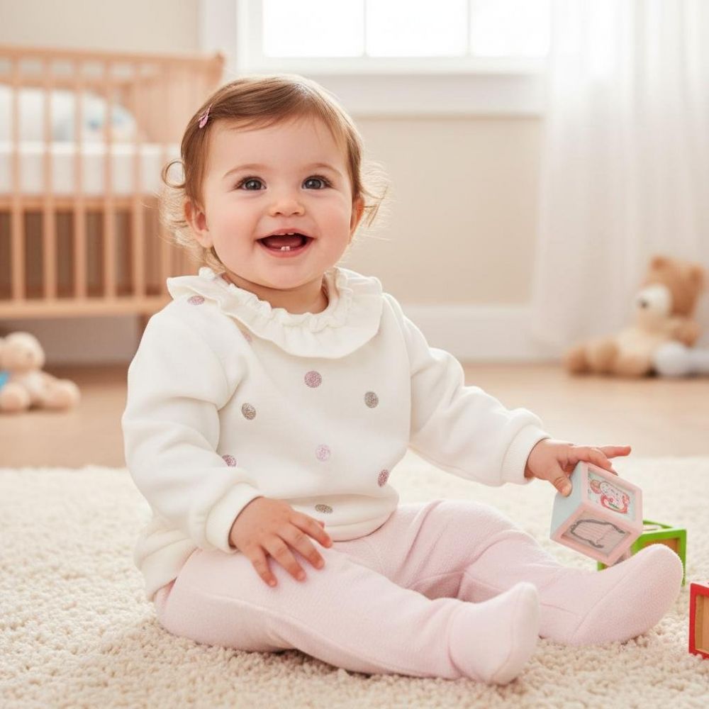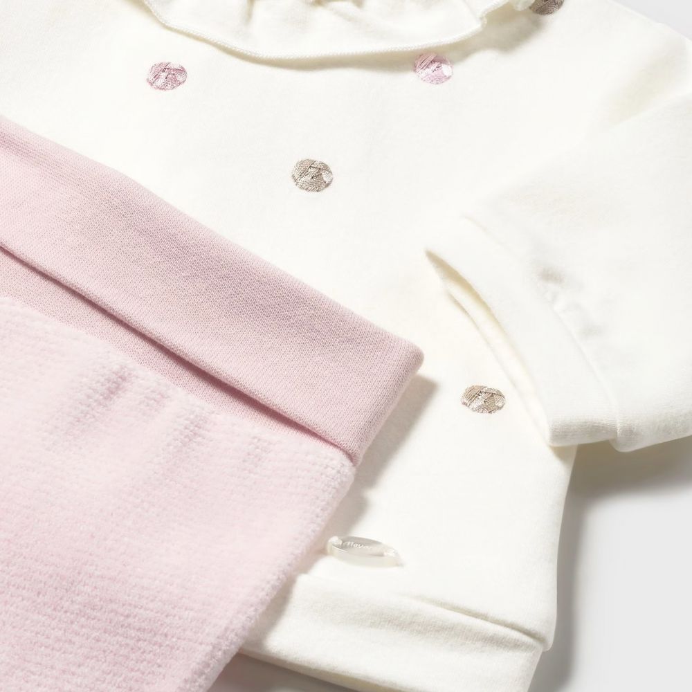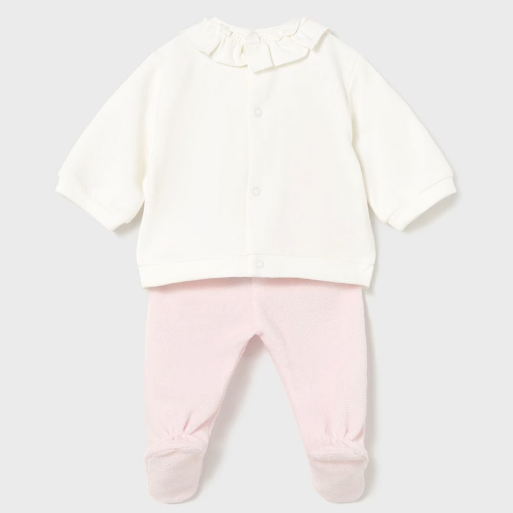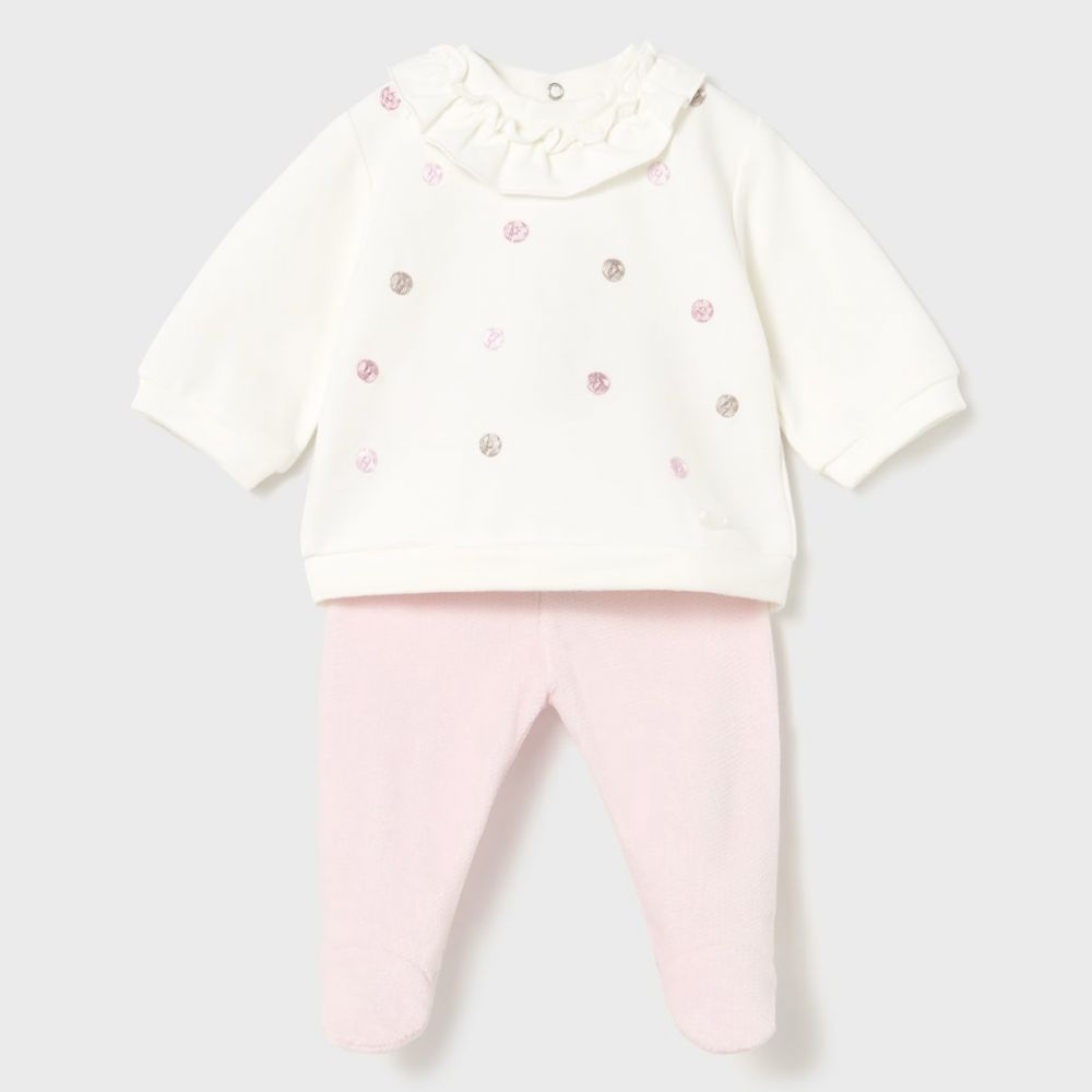 Βελούδινο βρεφικό σετ δύο τεμαχίων, ιδανικό για τις πρώτες εμφανίσεις της μικρής σας. Το σετ περιλαμβάνει ένα ζεστό, απαλό μπλουζάκι σε κρεμ απόχρωση με χαριτωμένα πουά κεντήματα και έναν κομψό γιακά με βολάν. Ολοκληρώνεται με ένα χνουδωτό ροζ παντελονάκι με πατουσάκια, που προσφέρει απόλυτη άνεση και ζεστασιά. Ένα υπέροχο, άνετο σύνολο που αγκαλιάζει απαλά το δέρμα του μωρού, ιδανικό για κάθε στιγμή.