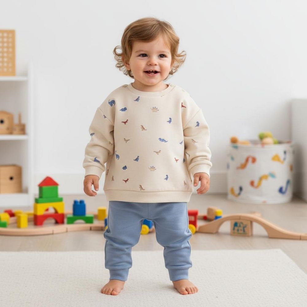 βρεφικό σετ ρούχων με σχέδια δεινόσαυρων. Το σετ αποτελείται από μία μπλούζα μακρυμάνικη και ένα παντελόνι. Η μπλούζα είναι εκρού με σχέδια μικρών δεινόσαυρων σε μπλε, κόκκινο και καφέ χρώμα, με μία μικρή τσέπη στο στήθος. Το παντελόνι είναι μονόχρωμο, σε απαλό μπλε. Αυτό το άνετο και παιχνιδιάρικο σετ είναι ιδανικό για καθημερινή χρήση.