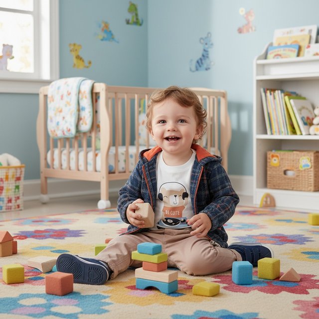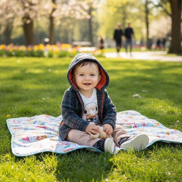 Βρεφικό σετάκι μωρού 3 τεμαχίων. Περιλαμβάνει ένα λευκό, μακρυμάνικο μακό μπλουζάκι με στάμπα έναν αρκούδο που ακούει μουσική, καφέ παντελόνι τύπου τζιν με ρυθμιζόμενο λάστιχο στην μέση του μωρού, με γυρισμένα ρεβέρ. και μια ζεστατή ζακέτα με κουκούλα, σε σκούρο μπλε και κόκκινο σκωτσέζικο καρό εσωτερικά φοδραρισμένο, με κεραμιδί λεπτομέρειες στο φερμουάρ. Ένα βρεφικό σετ ρούχων για φθινόπωρο και χειμώνα