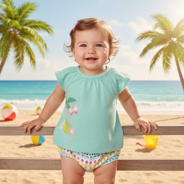 Καλοκαιρινό βρεφικό σετ ρούχων αποτελείται από δύο κομμάτια: ένα μπλουζάκι και ένα σορτσάκι. Το μπλουζάκι είναι σε χρώμα τιρκουάζ και έχει κοντά μανίκια. Διαθέτει ένα σχέδιο με έναν φοίνικα, μια πεταλούδα και ένα λουλούδι στο μπροστινό μέρος. Το σορτσάκι έχει ένα πολύχρωμο εμπριμέ σχέδιο. Και τα δύο κομμάτια είναι κατασκευασμένα από μαλακό, ποιοτικό ύφασμα, ιδανικό για το ευαίσθητο δέρμα του μωρού. Το μπλουζάκι κουμπώνει με κουμπάκι στην πλάτη.
