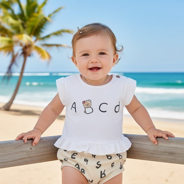 Βρεφικά Ρούχα σετ δυο τεμαχίων.Το σετ περιλαμβάνει μπλουζάκι λευκό με στάμπα σε φαρδιά γραμμή και σορτσάκι μπεζ με λάστιχο. Κατασκευασμένο από μαλακό ελαστικό βαμβακερό ύφασμα. Το βρεφικό Μπλουζάκι είναι αμάνικο. Διαθέτει Στρογγυλό λαιμό.Άνοιγμα με κλιπ στη πλάτη που επιτρέπουν να το φορέσετε εύκολα στο μωρό σας
