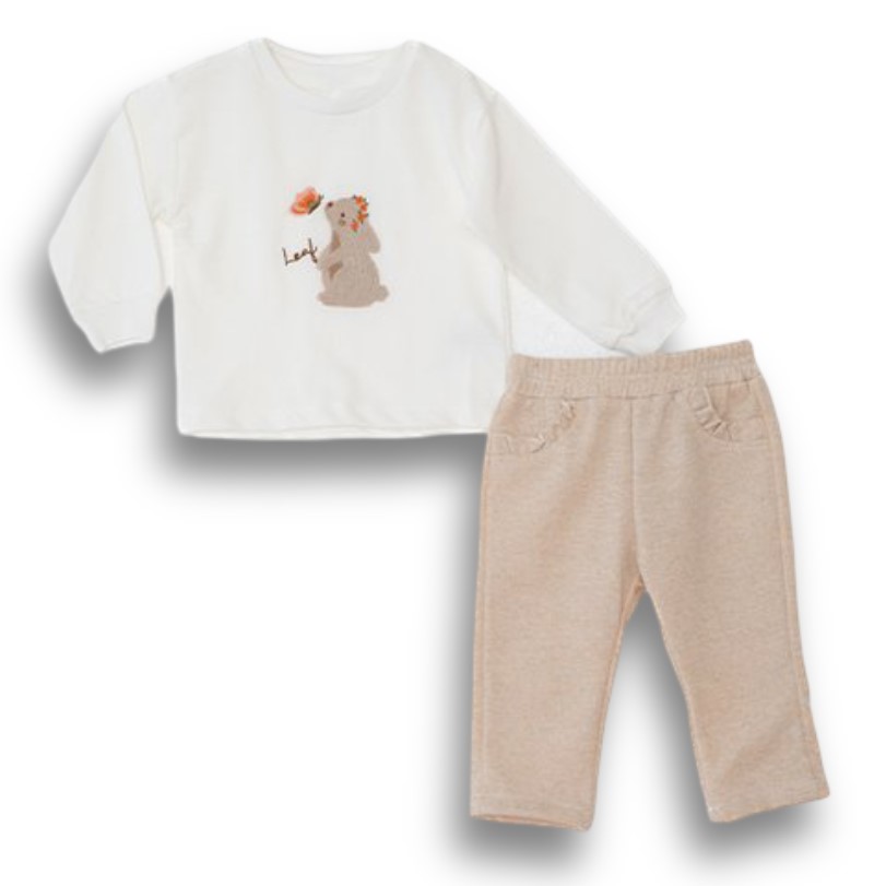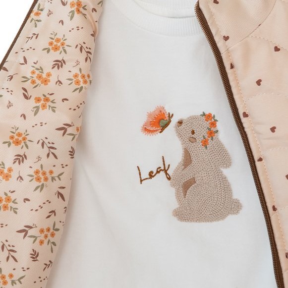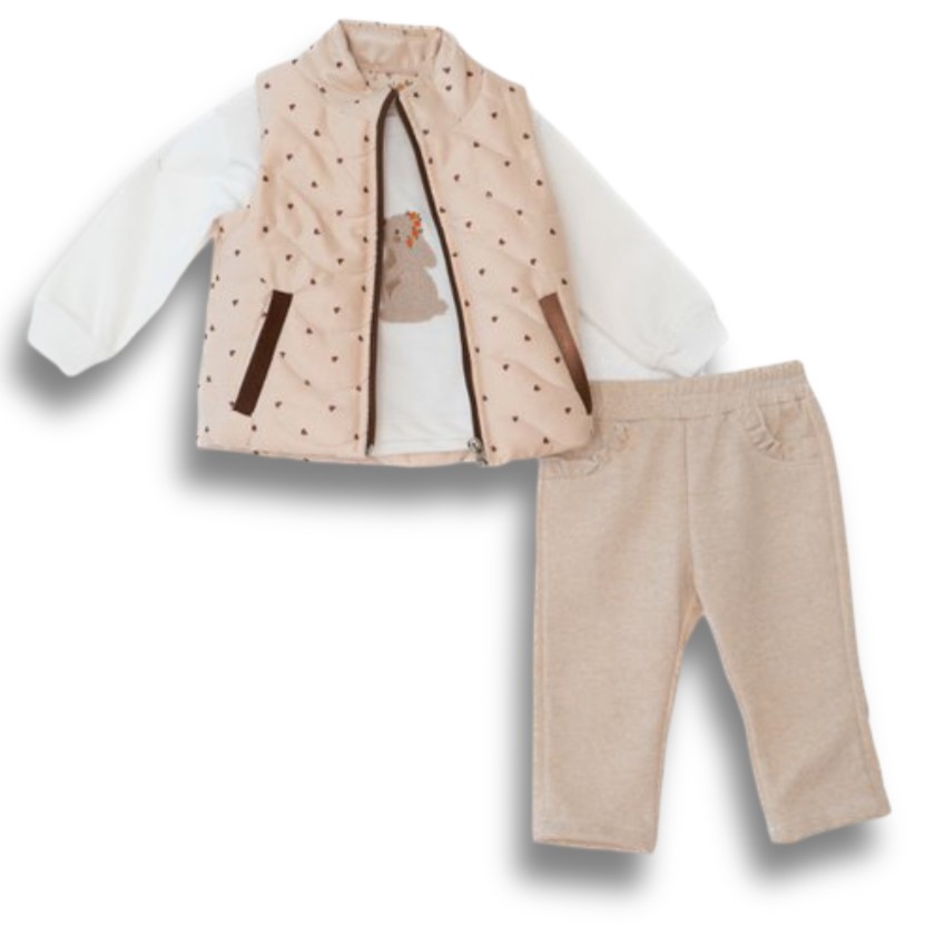 Βρεφικό σετ ρούχων για κορίτσια, ιδανικό για μικρές κυρίες τους χειμερινούς μήνες. Περιλαμβάνει μακρυμάνικο μπλουζάκι μακό κρεμ με κέντημα λαγουδάκι, μπεζ μελανζέ κολάν, σε συνδυασμό με αδιάβροχο γιλέκο-μπουφάν. Μία ζεστή και πρακτική επιλογή για μωρά ηλικίας 6 έως 24 μηνών, που προσφέρει άνεση και προστασία από το κρύο. Ένα πλήρες και μοντέρνο σύνολο για όλες τις ώρες της ημέρας της μικρής πριγκίπισσας.