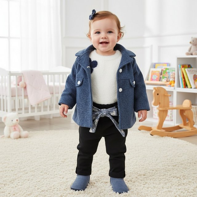 Το κοριτσίστικο σετ ρούχων αποτελείται από τρία κομμάτια, δημιουργώντας ένα κομψό και ζεστό σύνολο. Περιλαμβάνει ένα μπλε μοντγκόμερι με λευκά κουμπιά και γιακά, και με φλοράλ επένδυση, που προσδίδει μια χαριτωμένη λεπτομέρεια. Το πουλόβερ είναι εκρού, μακρυμάνικο, με αφράτη υφή και τρία διακοσμητικά λουλούδια στο μπροστινό μέρος. Το σύνολο ολοκληρώνεται με ένα σκούρο παντελονάκι με φαρδύ λάστιχο στη μέση και μια υφασμάτινη ζώνη-φιόγκο με το ίδιο φλοράλ μοτίβο όπως η επένδυση του παλτό. Το σύνολο είναι ιδανικό για τις πιο κρύες μέρες, συνδυάζοντας άνεση και στυλ.