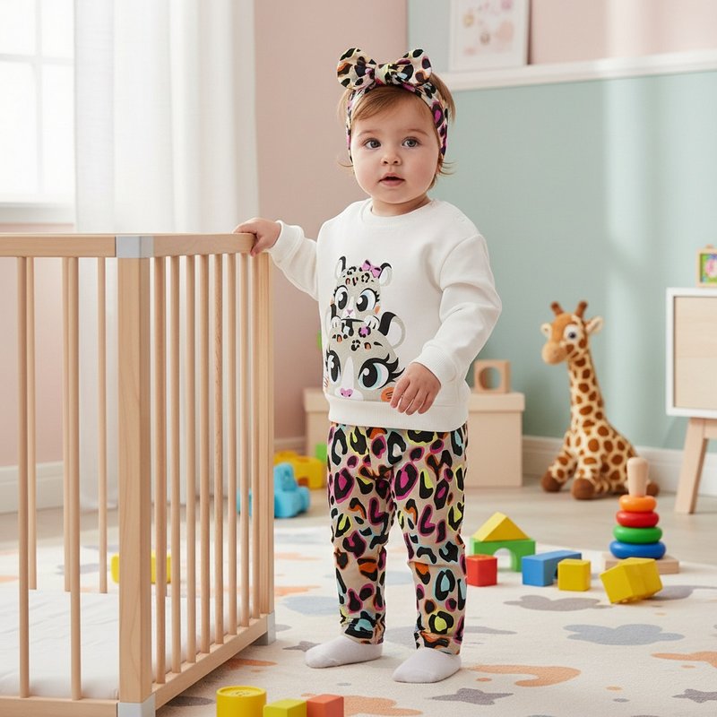 Βρεφικό σετ ρούχων που αποτελείται από ένα λευκό μπλουζάκι, ένα πολύχρωμο κολάν με μοτίβο λεοπάρ και μία ασορτί κορδέλα μαλλιών.Το μπλουζάκι διαθέτει στην μπροστινή του πλευρά μια χαριτωμένη στάμπα με δύο τίγρεις. Το κολάν και η κορδέλα έχουν εντυπωσιακό σχέδιο με χρωματιστές κηλίδες σε διάφορα έντονα χρώματα (ροζ, κίτρινο, πορτοκαλί, μπλε) πάνω σε μπεζ φόντο.