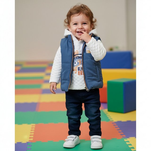 Αυτό το βρεφικό σετ για αγόρια αποτελείται από ένα μακρυμάνικο μπλουζάκι με κουκούλα σε λευκό χρώμα, με ένα πρωτότυπο σχέδιο. Το μπλουζάκι διαθέτει καπιτονέ ύφανση, προσδίδοντας υφή και επιπλέον ζεστασιά. Το σετ συμπληρώνεται από ένα αμάνικο, ενισχυμένο μπουφάν σε μπλε απόχρωση, με φερμουάρ και πορτοκαλί λεπτομέρειες, ιδανικό για τις πιο κρύες μέρες. Τέλος, το παντελόνι τύπου τζιν σε σκούρο μπλε χρώμα ολοκληρώνει το σύνολο, προσφέροντας άνεση και στυλ. Ένα μοντέρνο και άνετο σετ για κάθε περίσταση.