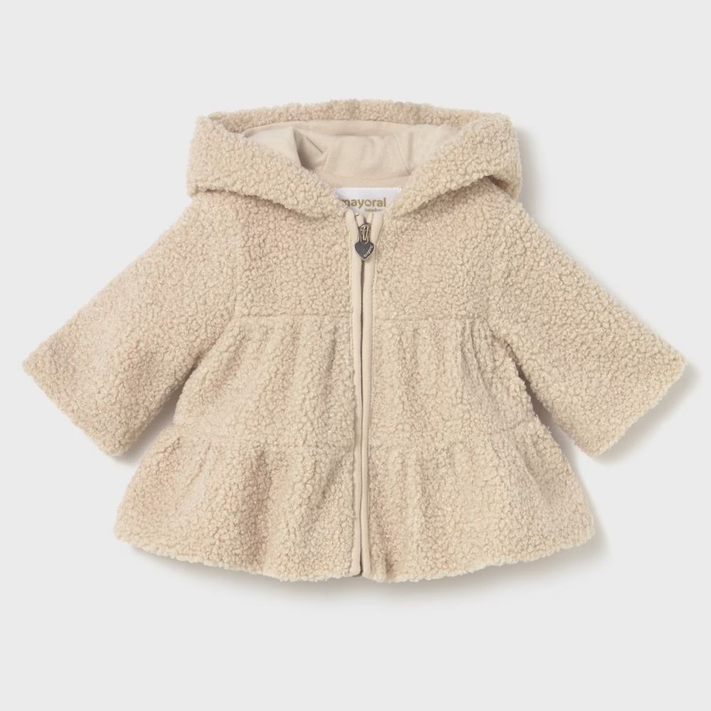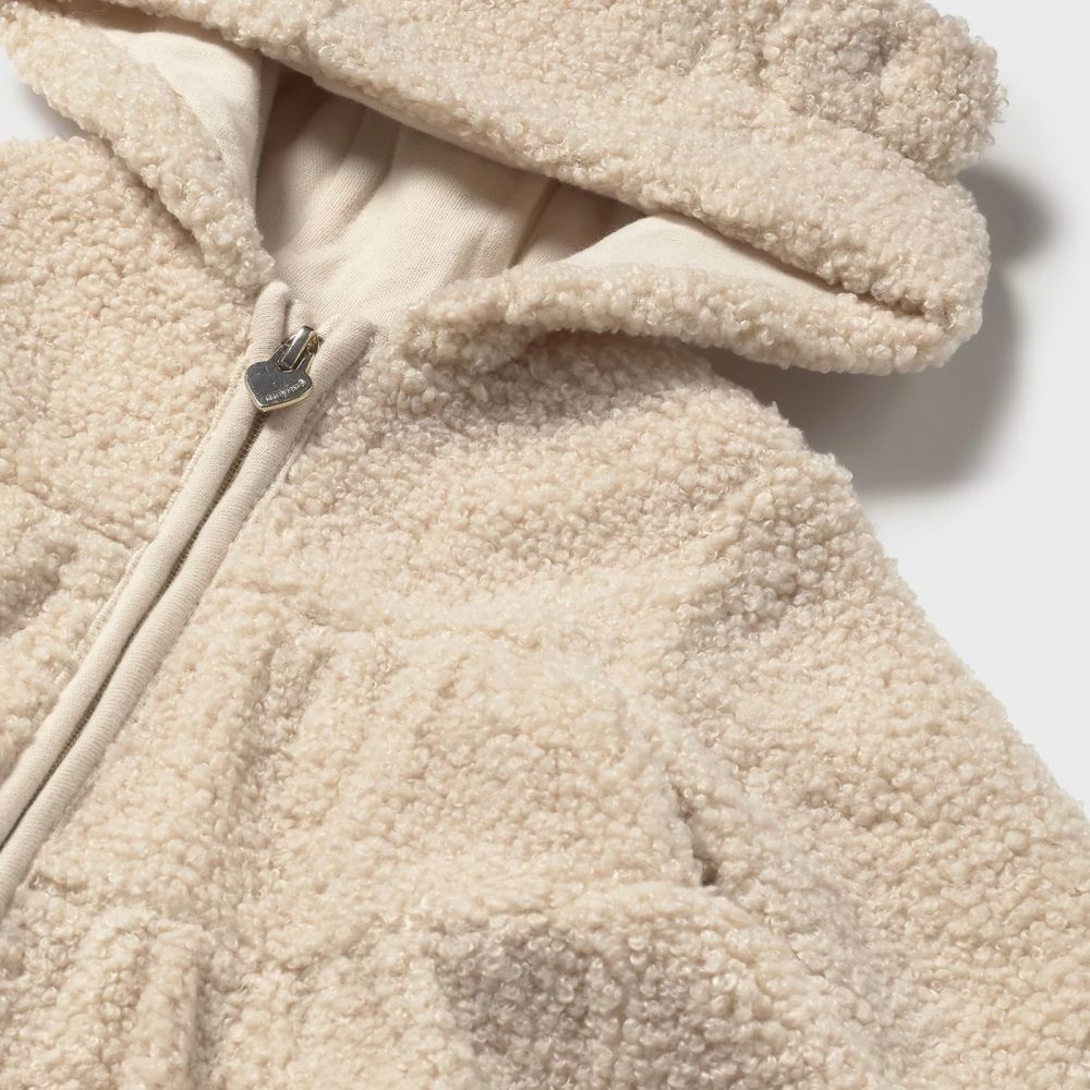 Αυτή η μπεζ βρεφική ζακέτα της Mayoral είναι σχεδιασμένη για να προσφέρει ζεστασιά και άνεση στο μωρό σας. Είναι κατασκευασμένη από μαλακό προβατάκι φλις ύφασμα που μοιάζει με αρκουδάκι (teddy bear), ενώ διαθέτει κουκούλα και κλείσιμο με φερμουάρ για εύκολη χρήση.